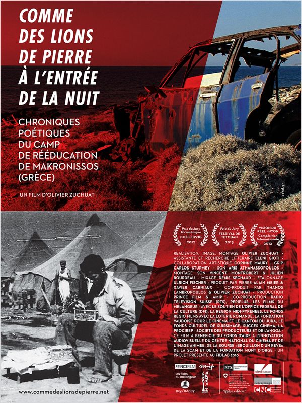 Entre 1947 et 1951, plus de 80 000 hommes, femmes et enfants grecs ont été internés sur l’îlot de Makronissos (Grèce) dans des camps de rééducation destinés à lutter « contre l’expansion du communisme ». Parmi ces déportés se trouvaient de nombreux écrivains et poètes, dont Yannis Ritsos et Tassos Livaditis. Malgré les privations et les tortures, ces exilés sont parvenus à écrire des poèmes qui décrivent leur (sur)vie dans cet univers concentrationnaire. Ces textes, pour certains enterrés dans le sol du camp, ont été retrouvés. « Comme des lions de pierre à l’entrée de la nuit » mêle ces écrits poétiques avec des discours de rééducation politique qui étaient diffusés en permanence dans les haut-parleurs des camps. De longs travellings, tels des mouvements hypnotiques, arpentent les ruines des camps et “se heurtent” aux archives photographiques. Un essai filmé qui ranime la mémoire de ruines oubliées et d’une bataille perdue. (Source : Allociné)