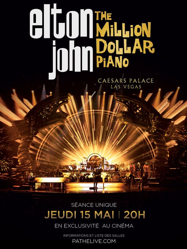 Diffusion en exclusivité au cinéma, jeudi 15 mai à 20h, du dernier concert d’Elton John « The Million Dollar Piano », dans plus de 80 salles en France. Mise en scène spectaculaire, scénographie et éclairages de scène fabuleux ; tout a été conçu spécialement pour accompagner la pièce maîtresse du show : le fameux « piano à un million de dollars ». Filmé à Las Vegas, l'occasion de redécouvrir les plus grands succès de l’artiste.