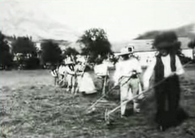 Cette vue photographique animée, montre une équipe d’agriculteurs et agricultrices retournant l’herbe fraîchement fauchée afin de la faire sécher.(Source : Wikipédia)