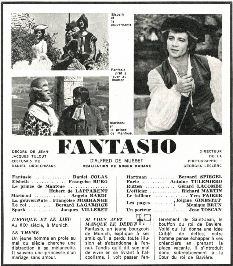 Fantasio est cynique, blasé, révolté. Il a « le mois de mai sur les joues, le mois de janvier dans le cœur ». Bref, il s'ennuie, malgré sa jeunesse. Dans cette Allemagne mi-bourgeoise, mi-féodale et romantique où il vit, son ami Spark, solide gaillard qui sait composer avec la médiocrité de la société, tente en vain de le ramener au « normal ». Mais ce que Fantasio cherche au plus profond de lui, c'est une grande pensée, une grande action à accomplir. Celle-ci se présente à lui le jour où l'on prépare le mariage – forcé – de la princesse Elsbeth avec un fat et ridicule prince de Mantoue. Fantasio prend la place du fou de la Cour qui vient de mourir, et sous ce déguisement, tente de convaincre l'héritière du trône d'obéir à son cœur plutôt qu'à la raison d'État.... (Souce Wikipedia)