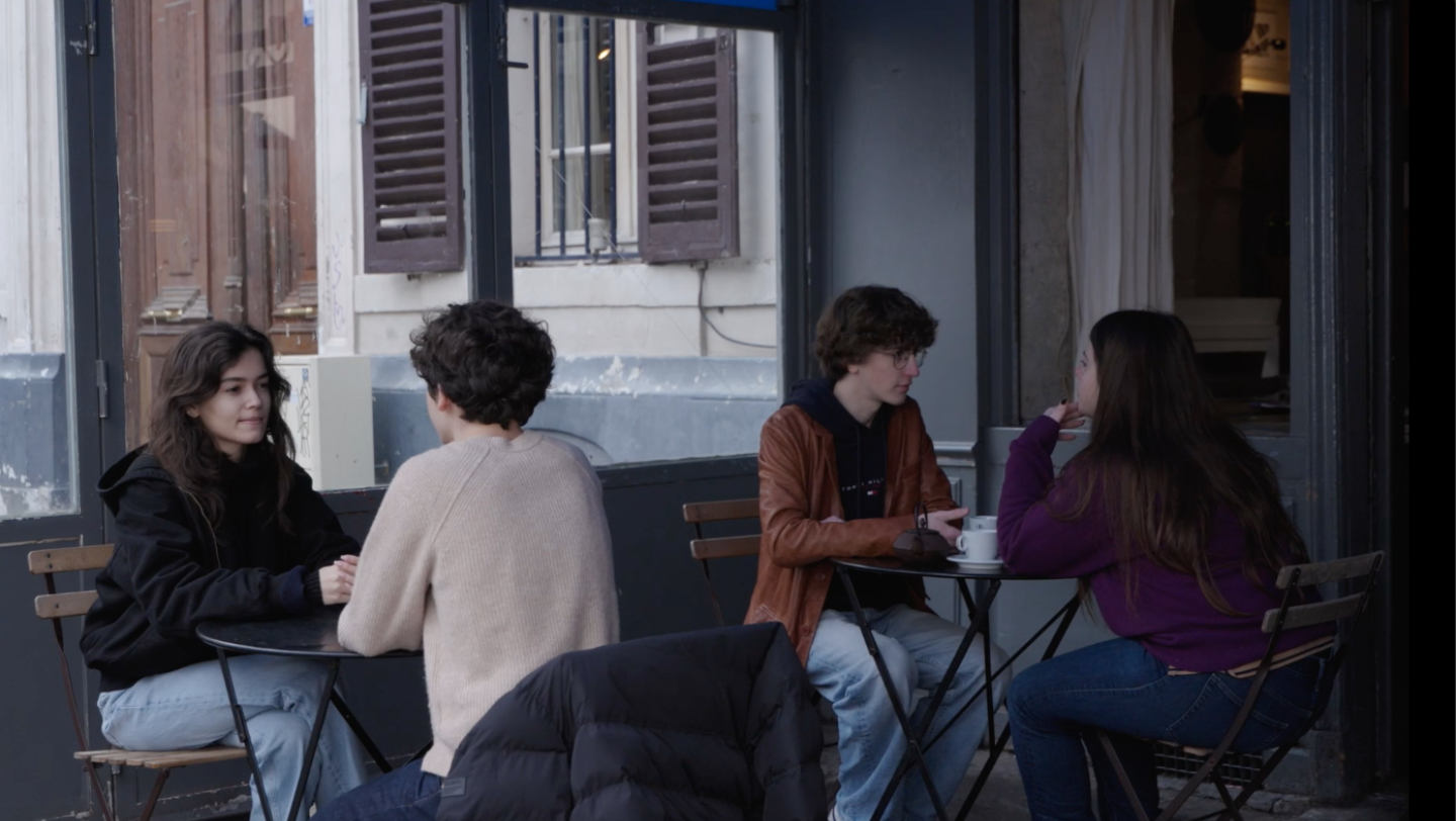 Une terrasse de café. Des couples d’adolescents sont installés ici et là. Ils discutent de choses de la vie, mais curieusement avec l’expérience de personnes bien plus âgées qu’ils n’y paraissent. Attentif et bienveillant, le serveur du café leur répond en chanson, offrant ainsi une fantaisie filmée. (Source : Côté court)