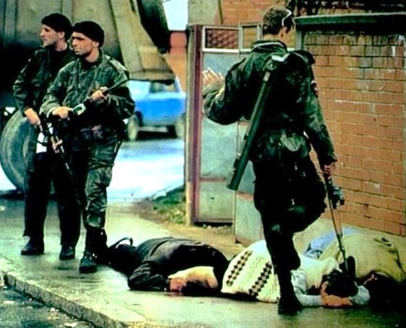 Conçu à partir d'une photographie de Ron Haviv prise à Sarajevo pendant le siège de la capitale de la toute jeune Bosnie-Herzégovine par l'armée serbe, Je vous salue Sarajevo dénonce l'acte de guerre, la torture et la résistance.