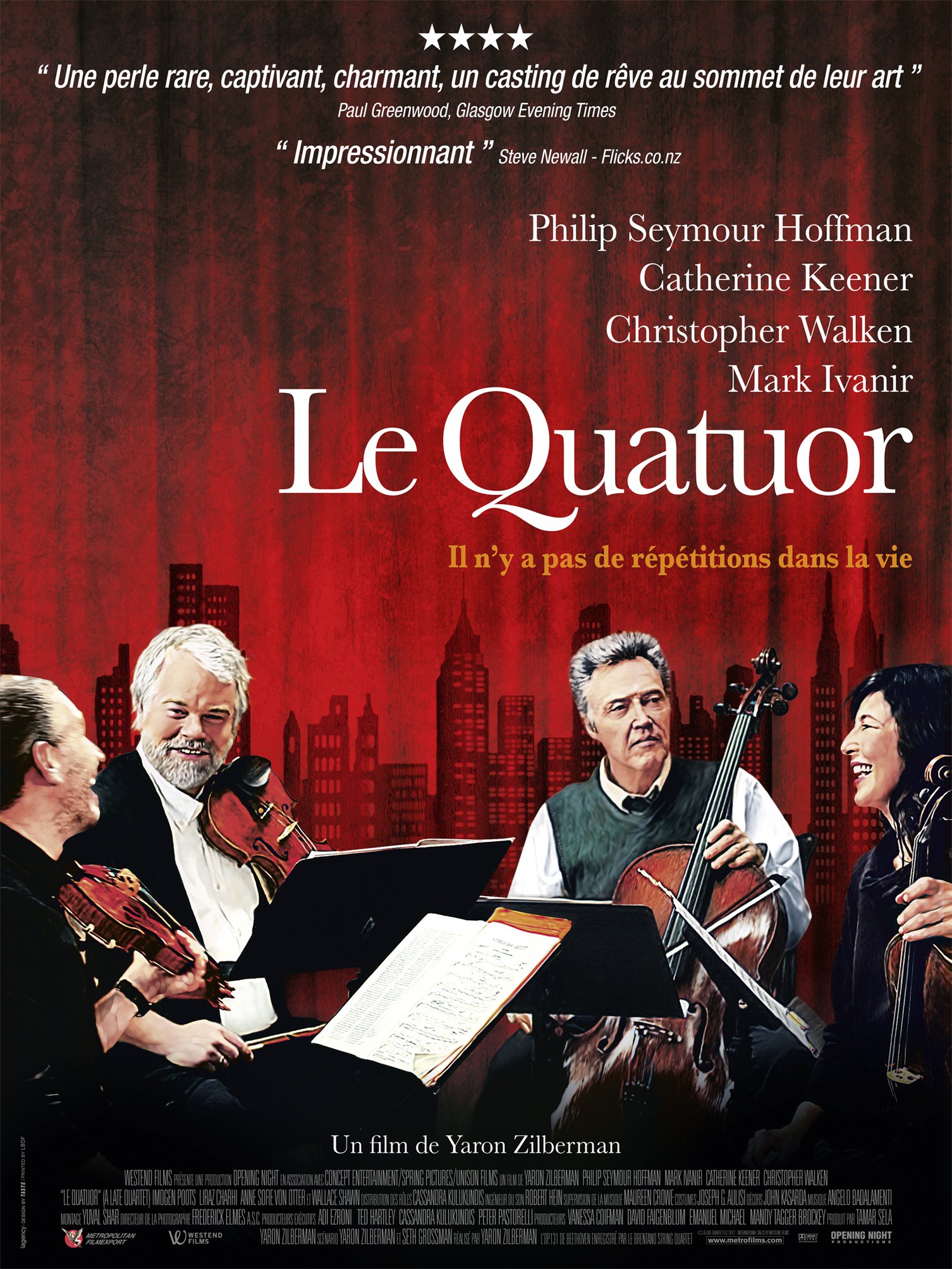 Lorsque le violoncelliste d’un quatuor à cordes de renommée mondiale apprend qu’il est atteint de la maladie de Parkinson, l’avenir du groupe ne tient plus qu’à un fil. Entre les émotions refoulées, les egos et les passions incontrôlables qui se déchaînent alors, la longue amitié qui unit les quatre virtuoses menace de voler en éclats. À la veille du concert qui célèbrera leur 25e et sans doute ultime anniversaire, seuls leurs liens étroits et le pouvoir de la musique peuvent encore préserver ce qu’ils ont construit.