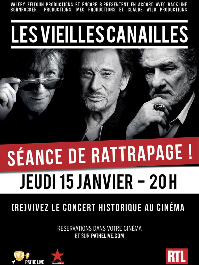 Le concert historique LES VIEILLES CANAILLES revient en exclusivité au cinéma pour une ultime séance le jeudi 15 janvier à 20h en France, Belgique et Suisse ! En novembre dernier, Johnny Hallyday, Jacques Dutronc et Eddy Mitchell s’étaient retrouvés sur scène pour la première fois ! Cet événement unique avait été alors retransmis en direct par Pathé Live dans les cinémas. Pour celles et ceux qui n’avaient pas pu assister ni au concert, ni à la retransmission au cinéma, nous vous donnons la possibilité de vivre ou revivre ce concert en exclusivité au cinéma près de chez vous lors d’une séance unique de rattrapage le jeudi 15 janvier à 20h. Un spectacle d’anthologie que vous pourrez vivre à travers 15 angles différents sur grand écran dans des conditions optimales (image haute définition et son 5.1) !