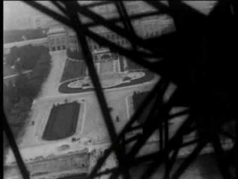 Panorama du palais du Trocadéro pris depuis un ascenseur de la tour Eiffel, dont on aperçoit la structure au premier plan. (Source : Catalogue Lumière)