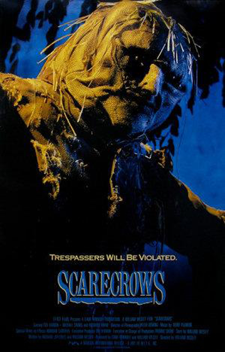 Scarecrows is about five bank robbing paramilitary mercenaries and war criminals who steal three million dollars from Camp Pendleton and take two hostages, a pilot and his daughter. As the robbers fly towards Southern waters, one of the robbers steals the loot and parachutes into a dark field. The remaining robbers land the plane and head for a broken-down house. The house has a demonic history, which causes scarecrows guarding surrounding graves to resurrect and slaughter all trespassers, dooming their victims to live on as scarecrows for all eternity. (Source : Wikipédia)