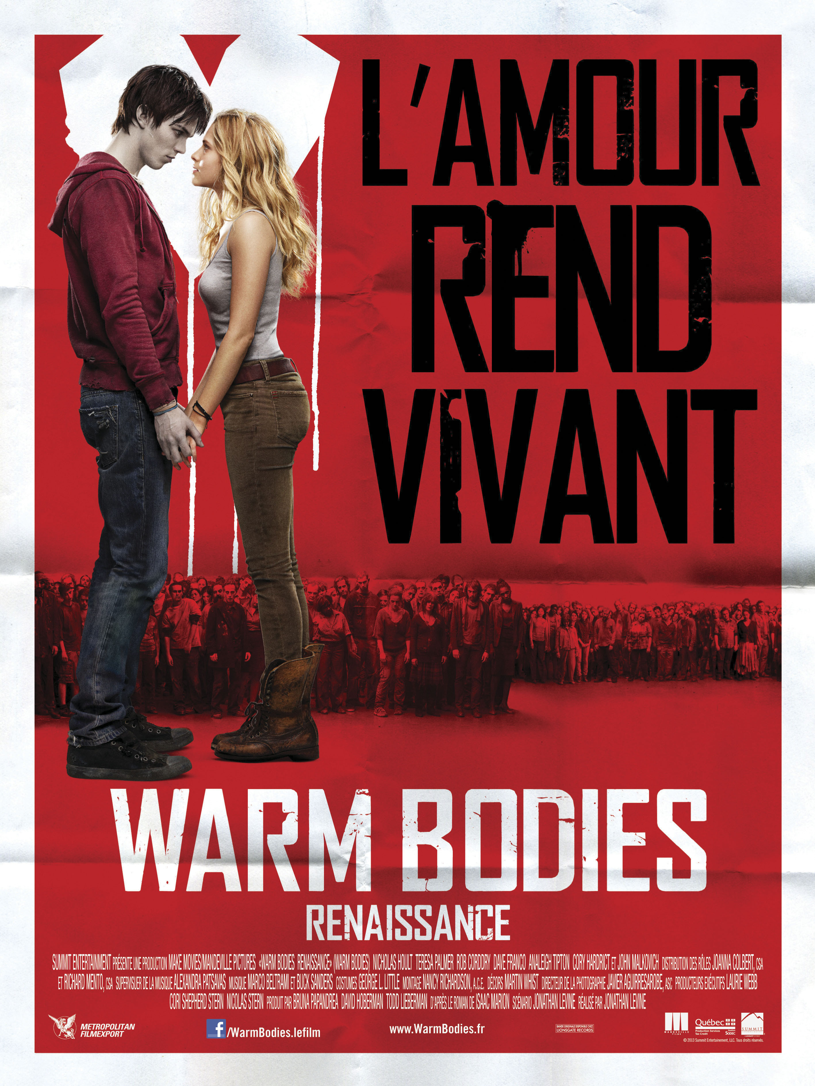 Jonathan Levine est plus qu’un visionnaire ; il a en son fort intérieur cette incroyable aisance lui permettant d’allier les composants du cinéma contemporain : humour, horreur, action et SF d’apocalypse. Après avoir surpris les non moins fanatiques de blagues potaches effet Judd Apatow (50/50), Mr. Levine cible à travers Warm Bodies un public bien plus exigeant qui ne cesse d’en demander plus, crise oblige. Et le moins que l’on puisse dire, c’est que le style romance assez irritant à la base n’a jamais aussi bien fonctionné au cinéma (les dialogues sulfureux entre zombie aidant à coup sur). Ce conte, délibérément absurde et provocant, concilie à la perfection le cahier des charges du film délirant en premier lieu, puis touchant en second temps. La faute à un Nicolas Hoult aussi méconnaissable que crédible, et à une Teresa Palmer sous ses meilleurs jours. Sur fond de décor apocalyptique ténébreux, Warm Bodies divulgue une facette de la condition humaine qui réchauffe les cœurs : la recherche de l’amour presque impossible… Et pourtant.