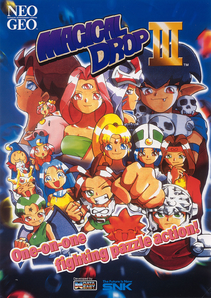 Dans Magical Drop III sur Neo Geo, vous contrôlez un clown qui attrape et lance des ballons. Vous devez les rassembler par couleurs identiques pour qu'ils explosent et libèrent de la place. Le mode deux joueurs vous permet d'affronter le CPU ou un ami, et cette fois-ci, vous pouvez choisir votre personnage, doté d'attaques qui lui sont propres.