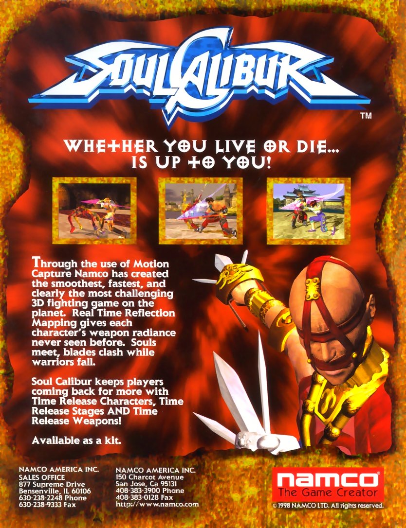 SoulCalibur sur Dreamcast est une référence du jeu de combat axé sur des affrontements à mains nues ou à l'arme blanche. La plupart des arènes permettent de propulser l'adversaire en dehors de celle-ci, l'esquive y joue donc un rôle primordial. A cela s'ajoute un très grand nombre de prises et de mouvements possibles pour chaque personnage.