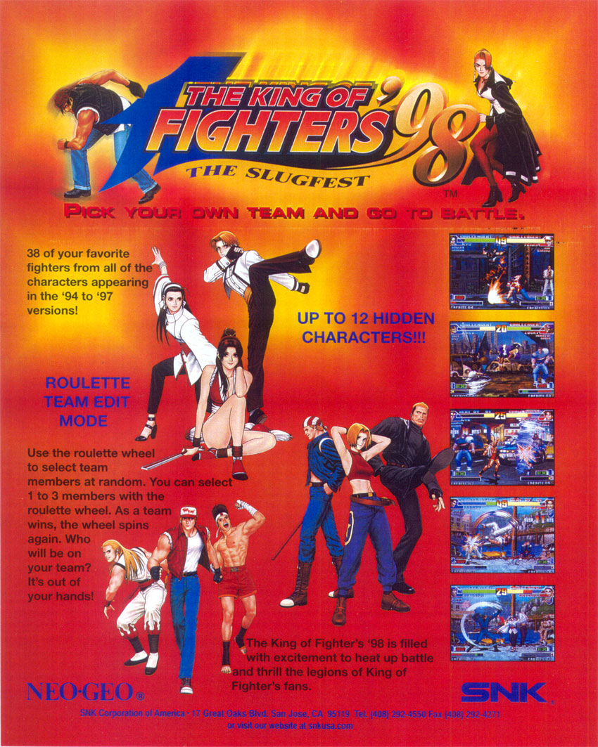 Cet épisode est un Dream Match : il ne s'inscrit pas dans la continuité scénaristique des épisodes précédents, ne possède pas d'histoire établie et intègre des personnages apparus dans les opus précédents (KOF '94 à '97), indépendamment du fait que ces personnages peuvent être décédés dans l'histoire continue de la série. 38 personnages, 13 versions alternatives, de nombreux modes de jeu seul ou à deux, il y a de quoi faire.