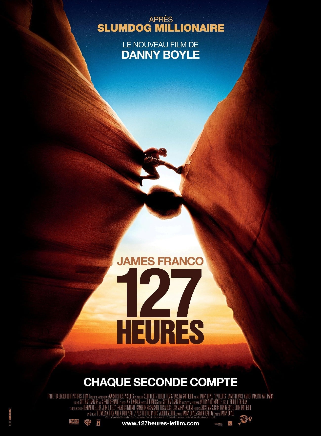 Faut avouer qu'un scénario pareil, c'est ultra risqué... Mais quand on s'appelle Danny Boyle, on peut transformer de la merde en or ! Esthétiquement et visuellement, comme d'habitude c'est vraiment ahurissant. La mise en scène inimitable est totalement signée et assumée, et c'est ce qui rend ce film accrocheur pendant 1h30. Et même si chacun connait le dénouement de l’histoire, la tension reste palpable dès le moment où Aron se coince le bras. La séance de « découpage » est glauque à souhaits, et on a presque autant envie que ce malheureux bonhomme que tout ça se finisse. Bon par contre, adeptes de l’action effrénée, passez votre chemin. Pour finir, l’affiche est intelligemment pensée =)