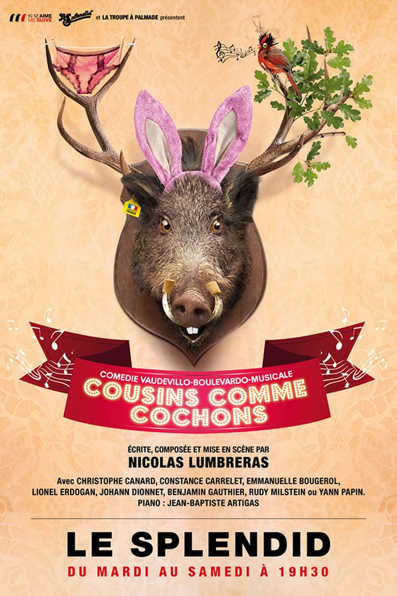 Cousins Comme Cochons, c'est une nouvelle recette de la Troupe à Palmade : Une louche de Comédie musicale dans une soupière de Vaudeville. Huit comédiens-chanteurs de la Troupe à Palmade au service de cette Comédie Boulevardo-Vaudevilo-Musicale, écrite et composée par Nicolas Lumbreras, dans laquelle vous découvrirez un amant dans le placard, un sanglier à la moutarde, une femme de chambre, une chambre, une femme, des pieds qui gonflent, un jardinier sourd de naissance, un arbre qui chante, un notaire libidineux, et du yaourt américain. Le tout accompagné d'un pianiste. Et d'un piano.