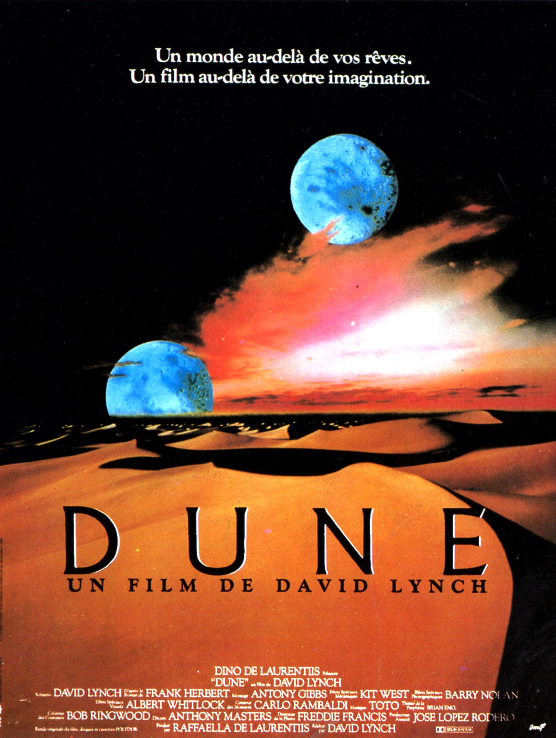 Dune de 1984 ose l'action avec les moyens du bord, et dans l'ensemble, tout est en place, l'histoire est là, j'aime aussi particulièrement le fait d'oser mettre des personnages laids. (Tout le monde en prend pour son grade.)