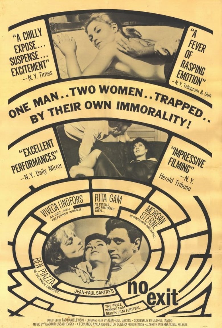Le Valet (Manuel Rosón) entre dans une chambre d'hôtel avec Joseph Garcin (Morgan Sterne) à la remorque. La chambre sans fenêtre a une seule entrée et aucun miroir. Deux femmes, Inès Serrano (Viveca Lindfors) et Estelle Rigault (Rita Gam), sont ensuite dirigées; après, le Valet quitte et verrouille la porte. Réalisant qu'ils sont en enfer, le trio s'attend à être torturé; Cependant, aucun tortionnaire n'est disponible. En attendant, ils entament une conversation et discutent des péchés, des désirs et des souvenirs désagréables de chacun. Adaptation de la pièce de Jean-Paul Sartre. (Source : themoviedb)