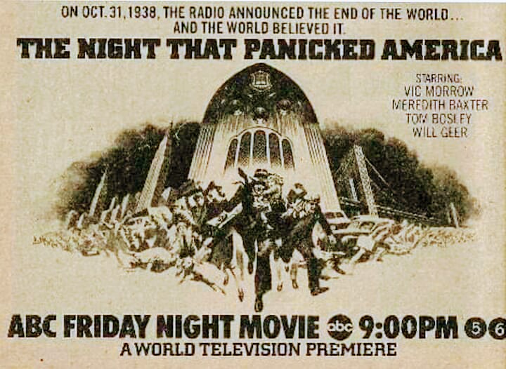 C est un téléfilm qui va parler de la guerre des mondes au moyen d une diffusion radiophonique et va paniquer en grand nombre de personnes qui sont persuadés d entendre non pas une pièce jouée pour la radio mais de croire que tout ce qui est dit est la réalité