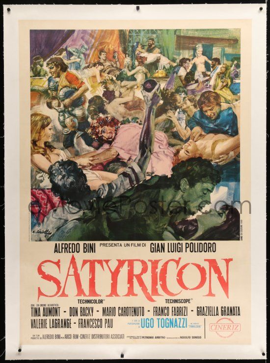 Deux jeunes amis, Encolpius et Ascyltus, voyagent de Rome à la villa de leur oncle Anneus Mela. Lors de ce voyage, fuyant les autorités douanières, ils arrivent d'abord dans une grotte dans laquelle la corrompue Tryphène organise des cérémonies en l'honneur du dieu Priape ; les deux aident jusqu'à l'arrivée de leur mari. Après avoir atteint Baia, où vit l'oncle, Encolpius est considéré comme le maître de la maison, car Anneus est recherché par Néron comme suspect dans le complot de meurtre contre sa femme. Les soldats de l'empereur étant à la porte, tous deux doivent à nouveau fuir, cette fois avec le jeune Gitone qui y est hébergé. Encolpius est capable de séduire le jeune homme dans des rapports sexuels et remporte ainsi le concours d'amour avec Ascyltus pour Gitone