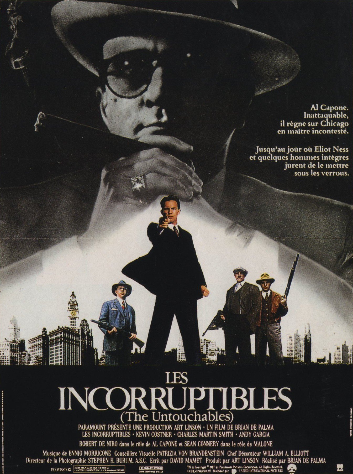 Les Incorruptibles, cette ligue des Gentlemen extraordinaires, est un conglomérat de trois hommes dont Sean Connery qui joue le rôle d’un balai-brosse spécial curling glissant sur des kilomètres de traînées de sang, qui opère sous la houlette de Kevin Costner. Ces hommes intègres doivent lutter contre vents et marées pour faire inculper Al Capone joué par De Niro qui cabotine de long en large et en travers. D’une musique outrancière et de situations pittoresques en situations pitoyables, de dialogues boursouflés en dialogues essoufflés, le film avance sans jamais approfondir aucun de ses sujets. Go to Serpico pour aborder la morale d’un héros et l’immoralité d’institutions gangrenées par l’argent. Expédition à Il était une fois la Révolution pour traiter de la prohibition. On ne dira pas que les personnages sont antipathiques mais...finalement si.