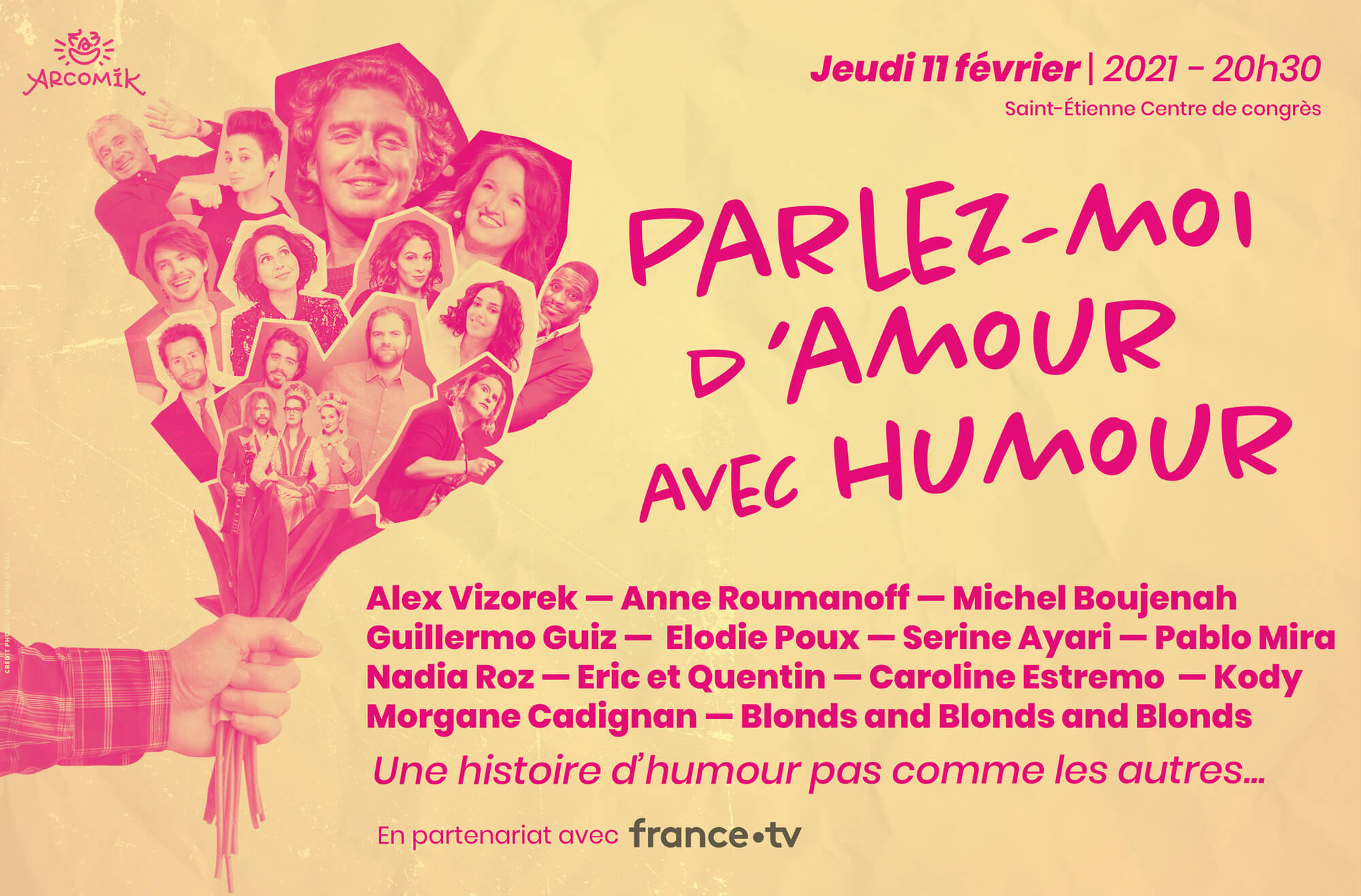 Alex Vizorek nous propose de vivre une histoire d'humour pas comme les autres lors d'une soirée où on parlera, certes d'amour, mais pas seulement avec ses invités : Anne Roumanoff, Michel Boujenah, Guillermo Guiz, Elodie Poux, Nadia Roz, Caroline Estremo, Kody, Serine Ayari, Eric et Quentin, Pablo Mira, Morgane Cadignan, Blonds and Blonds and Blonds.rnLe bouquet d’artiste pourrait devenir le comble du romantisme, ou pas… À vous d’en juger !rn(Source : arcomik)