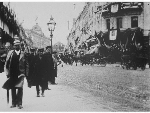 Un court métrage en noir et blanc capture l'activité d'une rue animée de Saint-Pétersbourg, en Russie.