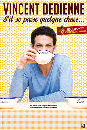 Bonjour ! Je m’appelle Vincent Dedienne et je suis la personne qui boit un chocolat chaud/thé vert bio/soupe à l’oignon sur l’affiche ! S’il se passe quelque chose, c’est une promesse. La promesse de passer ensemble un drôle de moment, à la frontière du théâtre et du Guatemala. S’il se passe quelque chose c’est aussi comme un dîner entre amis. C’est prévu de longue date, préparé avec amour et gourmandise, et ça commence à 20h. S’il se passe quelque chose, c’est mon premier spectacle.