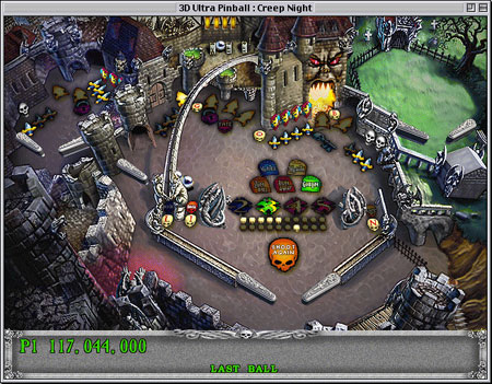 Les 3D UltraPinball se composent de 5 jeux, Creep Night est le deuxième de la série, sorti sur PC en 96 et porté sur Mac aux alentours de 98, il fut suivi de Lost Continent, Nascar Pinball et Thrillride Pinball, mais il est à mon sens le plus réussi de la série par son originalité, car malheureusement les variantes qui vinrent ensuite exploitèrent un peu trop le concept sans y apporter suffisamment d'innovations.rnrnParmi tous les jeux vidéo reprenant le principe des flippers (pinball), la série des 3D UltraPinball occupe une place singulière par les libertés prises dès le premier opus vis-à-vis de tout réalisme. On est absolument à l'opposé de la démarche d'Empire Interactive qui de 1996 à 1999 édita ce qui s'est fait de mieux en matière de simulation de flipper, allant jusqu'à fabriquer une véritable machine pour vérifier la justesse de leur programmation. Rien de tel dans les flippers de Sierra, qui à l'instar de nombreuses séries propres à cet éditeur (Hoyle's Book, par exemple), joue le clin d'œil et un certain second degré.rnrnCreep Night propose au joueur de taper la baballe dans trois univers de jeu assez proches : un château hanté, un dongeon malfamé et le laboratoire d'un savant qui a un petit air de famille avec Victor Frankenstein. Chacun de ces décors offre trois tables auxquelles on accède selon différents moyens, mais il n'y a pas de surprises, car toutes trois sont visibles à l'écran, elles ne sont d'ailleurs pas très vastes et offrent un nombre d'actions assez réduit (en règle générale, des fiches à tirer et un ou deux bumpers), mise à part la table centrale un peu plus riche. Une quatrième table est également cachée dans le jeu dans laquelle il faut affronter le chef des goblins si l'on obtient le nombre de points suffisants et que l'on sait en trouver l'entrée.rnrnEn tant que jeu de flipper, Creep Night n'est pas très difficile à manier, car il s'y cache peu de coups retors et de bumbers traîtres, mais les combinaisons à réussir sont assez variées car de temps en temps des éléments aléatoires apparaissent avec lesquels il faut composer, comme par exemple une armée de squelettes à viser en temps limités, du coup il faut acquérir une bonne dextérité pour faire grimper les scores et quelques réflexes.rnrnMais l'intérêt principal de Creep Night est, on l'aura deviné, dans la particularité des univers joués : on ne compte pas le nombre d'animations rigolotes et de goblins, squelettes, dragons et autres monstres venus de ces âges lointains qui traversent les tables et peuvent tout aussi bien défier le joueur que lui rire au nez. En outre, de petits jeux sont dissimulés ici et là, et c'est au hasard d'une combinaison que l'on tombera dessus, ils renforcent l'intérêt du jeu en variant les plaisirs.rnrnBeaucoup de choses sont configurables dans Creep Night, évidemment tout le fond sonore (voix, effets, musique) et les touches à utiliser, mais également le niveau de difficulté (facile / difficile), le nombre de boules (3 à 5), la profondeur de détails et l'effet de la gravité sur la balle. Les sensations de jeu sont intéressantes, bien que l'on soit très loin des ProPinball, ainsi les passages de balle ainsi que les contrôles sont fluides et répondent bien, en revanche les chocs sur les bumbers ou les cibles manquent d'élasticité ou de vivacité, la balle n'a pas de reflet changeants et fait parfois de drôles de pirouettes tout à fait irréalistes.rnrnPour conclure, les graphismes, l'ambiance et les sons rendent Creep Night attrayant, mais faut-il être un passionné des pinballs pour y jouer plus d'une heure ? Cela n'est pas certain, car pour un jeu de flipper Creep Night, contrairement à la gamme éditée par Maxis ou à certains produits Little Wings est beaucoup moins monotone et peut amuser quelques temps un non fanatique de flipper, de plus la difficulté du jeu est loin d'être diabolique ce qui en fait un produit tout public.rnrnhttp://www.grenier-du-mac.net/fiches/Jeux/3DUltraPB.Creepy.html