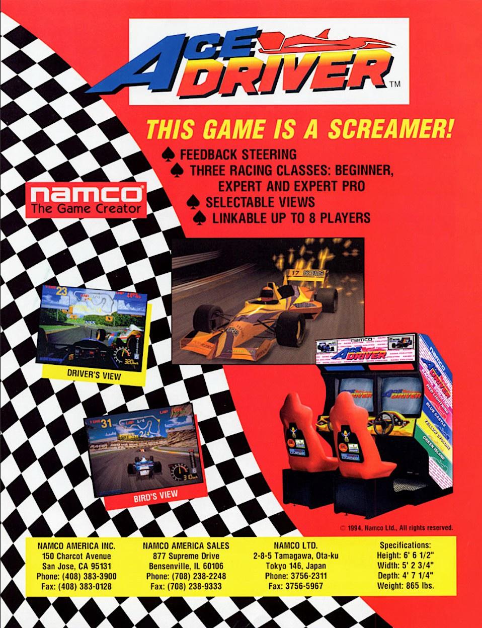 Jeu vidéo de course de Formule 1 en 3D, l'objectif étant de terminer trois tours d'une course tout en étant à la première place. Le joueur peut choisir l'un des huit véhicules jouables, qui est déterminé par le siège que le joueur a choisi sur le meuble lui-même. Les voitures portent également des publicités portant les noms d'anciens jeux vidéo et produits Namco, d'une manière similaire à la série Ridge Racer. Le joueur peut également choisir parmi trois niveaux de difficulté - Débutant, Expert et Expert Pro Race Class. Namco a produit deux versions du jeu, un modèle SD et un modèle DX. La version SD présente une structure assise de base, tandis que la version DX propose des sièges qui tournent en fonction des actions du joueur dans le jeu. Les deux armoires sont connectables et permettent de connecter une machine supplémentaire, ce qui permet un multijoueur à huit personnes.