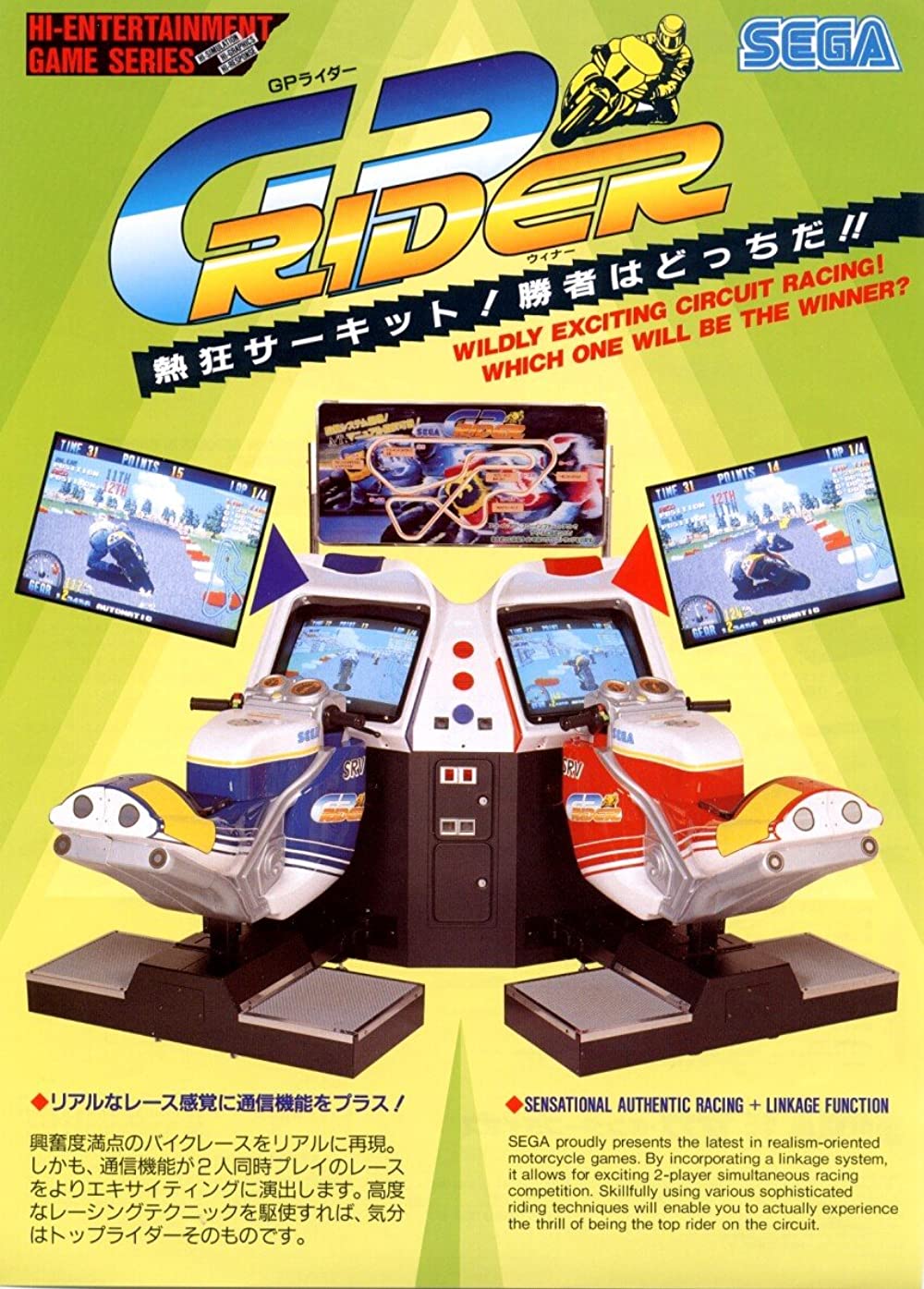 La version arcade est de conception similaire à Super Monaco GP - le joueur conduit une moto à transmission manuelle ou automatique à travers quatre tours d'un seul parcours, le seul objectif étant de gagner ou de battre le record de temps des autres joueurs.