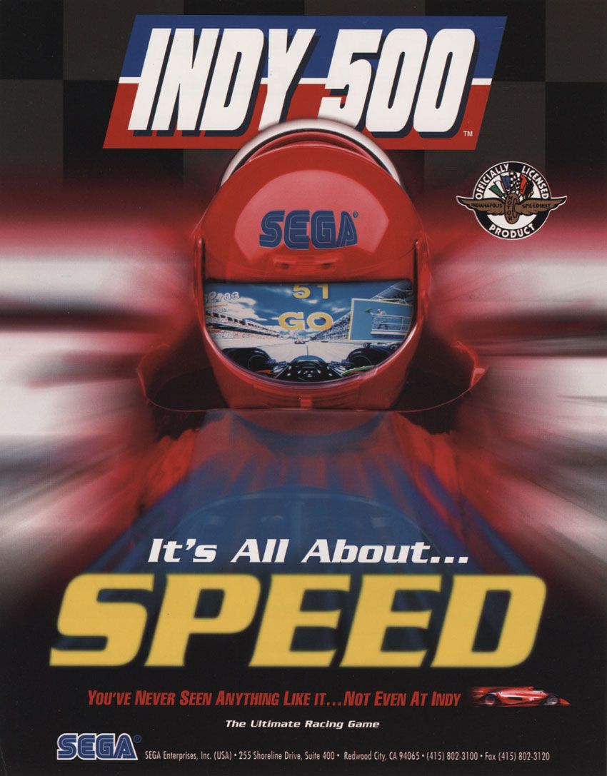 Indy 500 est un jeu de course basé sur l'IndyCar, et possède une licence officielle de l'Indianapolis Motor Speedway. Les joueurs peuvent courir sur l'un des trois parcours : Highland Raceway, Indianapolis Motor Speedway (appelé Indy 500 dans le jeu) et Bayside Street. La course commence après que l'utilisateur a fait son choix de transmission automatique ou de transmission manuelle avec un levier de vitesses à 2 positions. Les caractéristiques de l'armoire comprennent un volant avec retour haptique. Semblable aux précédents jeux de course d'arcade Sega, le jeu peut être joué sous l'un des quatre angles de caméra différents. Jusqu'à huit joueurs peuvent s'affronter en multijoueur via une fonction permettant de relier plusieurs bornes d'arcade.