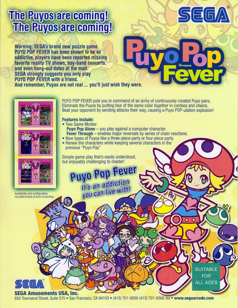 Puyo Pop Fever est un puzzle game dans lequel le but est d'aligner les Puyos de la même couleur afin de les faire disparaître. Si vous réussissez à faire plusieurs lignes à la suite, vous pouvez bloquer votre adversaire qui est en train de résoudre le même casse-tête que vous. En plus du mode classique découvrez des variantes du jeu qui permettent d'appréhender le gameplay sous d'autres angles.